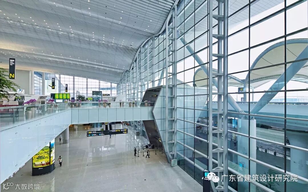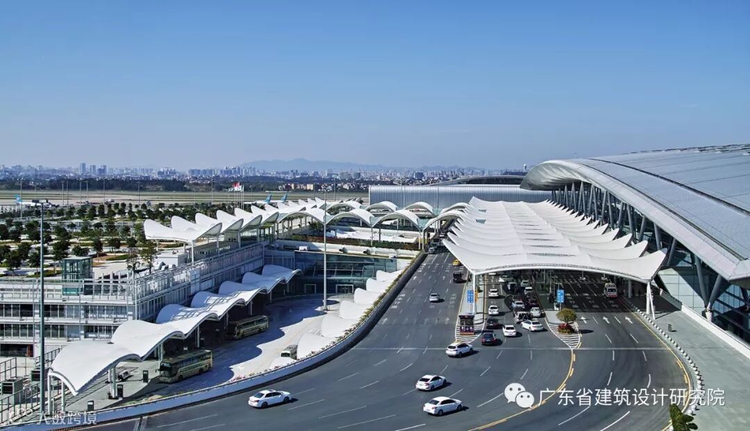 二号航站楼与南侧一号航站楼连成一体,造型强调标志性及创新风格,融入岭南地域特色,同时融合一号航站楼设计元素,强化弧形主楼、人字形柱及张拉膜雨篷这些白云机场特有元素。