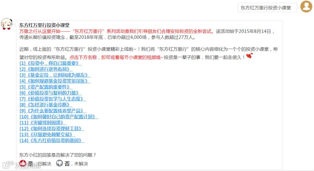 “东方红万里行”是东方红传递长期价值投资理念的全新尝试,截至2018年末已举办超过4000场啦!智能小红整合了“东方红万里行”的核心内容,输入“万里行”或“投资小课堂”,即可观看每节小课堂的精彩视频~