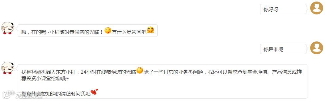 除了24小时在线陪伴您,它可以自我介绍、陪您聊天、查询净值或推荐投资小课堂给您。