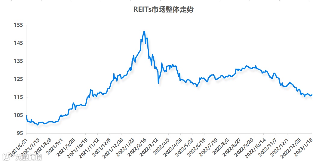 截至2023年1月20日,24只REITs总市值自上市以来累计涨幅7.846%,其中深圳能源REIT累计涨幅最高,达36.516%,上市以来,REITs市场整体走势如下图所示: