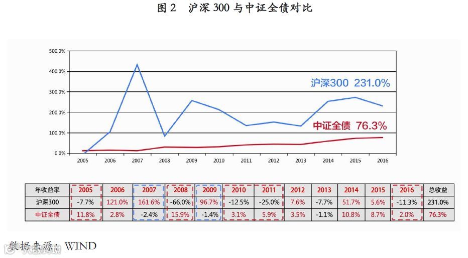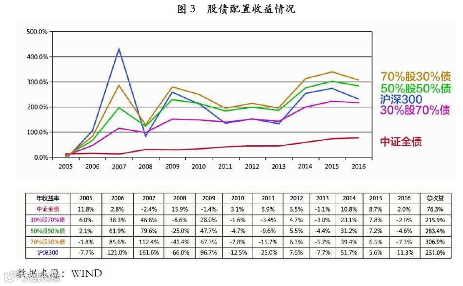 引用wind公开数据,我们以2005年至2016年12年间的沪深300和中证全债为例,进行股债搭配的效果比对。
