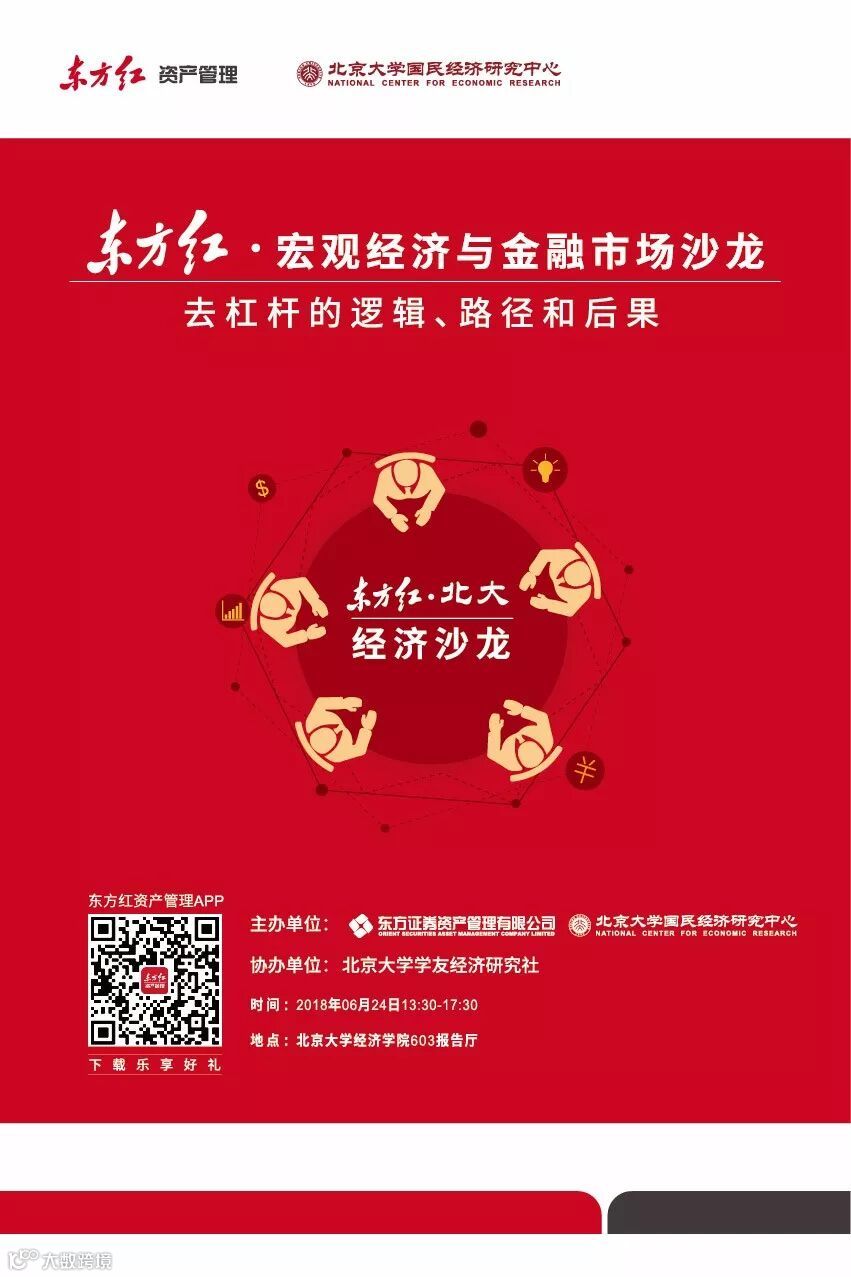 据悉,东方红北大经济沙龙第六场讨论会将围绕国内外经济走势,以“去杠杆的逻辑、路径和后果”为主题,邀请北京大学经济学院教授苏剑、东方证券资产管理有限公司私募固定收益投资部投资主办人蒋蛟龙、北京大学经济学院副教授冯科、国家信息中心经济预测部财金研究室主任李若愚等参与讨论,重点将围绕近期市场去杠杆调整,探讨经济现象背后的深层原因和逻辑,重视去杠杆下的信用重估,为资产配置方向提出建议。
