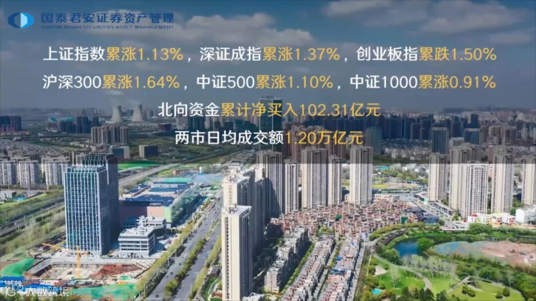最近一周A股多数指数均有上涨,上证指数累涨1.13%,深证成指累涨1.37%,创业板指累跌1.50%,沪深300累涨1.64%,中证500累涨1.10%,中证1000累涨0.91%。北向资金累计净买入约102.31亿元,两市日均成交额持续突破1万亿元。
