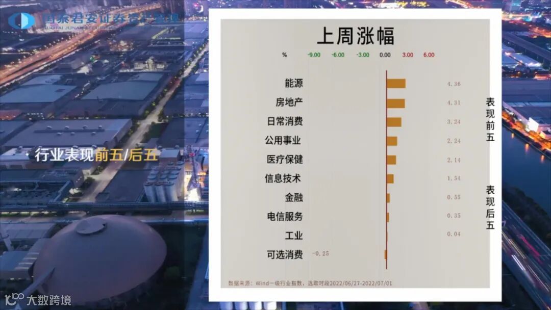 上周大部分行业均有上涨。能源行业领涨,涨幅为4.36%,房地产、日常消费等行业均有明显上涨。仅有可选消费一个行业下跌,跌幅为0.25%。