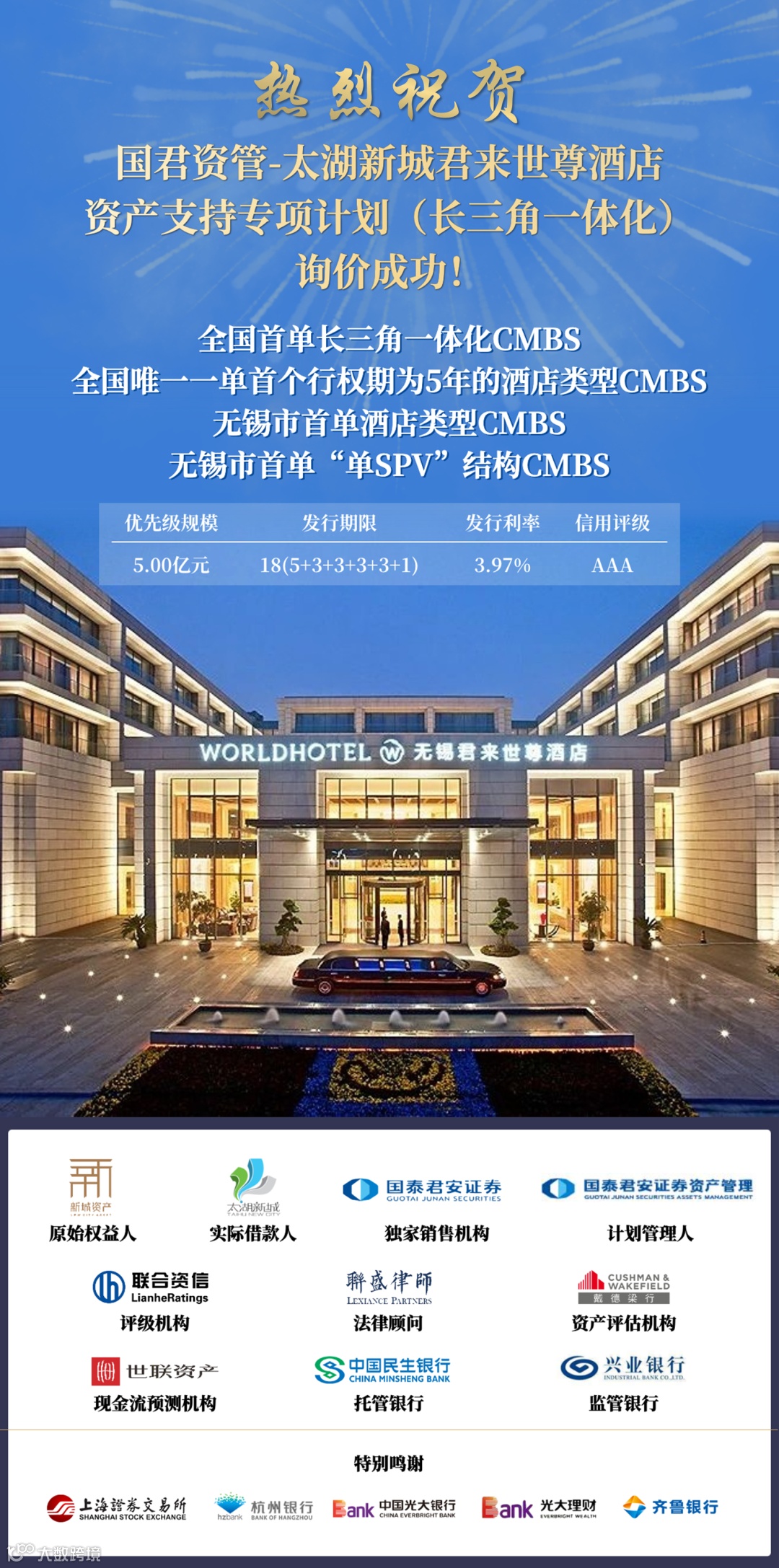 凭借强大的专业能力和创新能力,国泰君安投行事业部下债务融资部联合资管公司及江苏分公司积极响应太湖新城集团的融资需求,以无锡市君来世尊酒店为底层物业资产,协助发行人顺利获批无锡市首单酒店基础资产及“单SPV”结构CMBS。在项目发行阶段,国泰君安积极做好与监管部门的沟通,并深入探讨“长三角一体化”CMBS的可行性,协调发行人、中介机构、投资机构等各方工作安排,在疫情严重期间采用总分联动现场办公与远程办公配合的模式,保障发行工作有序进行,在符合疫情管控措施前提下各方通力配合满足投资者面签等个性化要求,最终助力本次长三角一体化CMBS项目顺利落地。