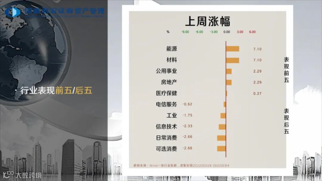 行业变动来看,上周能源与材料行业领涨,涨幅达7.1%,公用事业、房地产等行业均有上涨;可选消费与日常消费领跌,跌幅达2.6%。