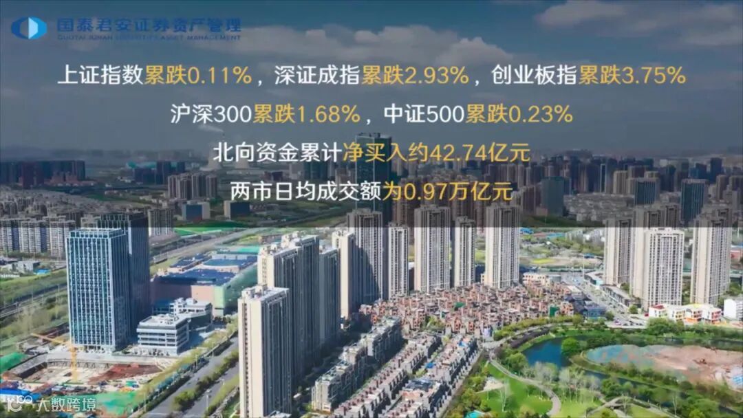 最近一周A股呈现下跌态势,主要指数均现下跌。上证指数累跌0.11%,深证成指累跌2.93%,创业板指累跌3.75%,沪深300累跌1.68%,中证500累跌0.23%。北向资金累计净买入约42.74亿元,两市日均成交额达0.97万亿元。