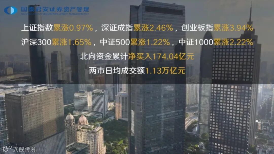 最近一周A股整体呈现普涨态势,上证指数累涨0.97%,深证成指累涨2.46%,创业板指累涨3.94%,沪深300累涨1.65%,中证500累涨1.22%,中证1000累涨2.22%。北向资金本周买入174亿元,两市日均成交额持续突破1万亿元。