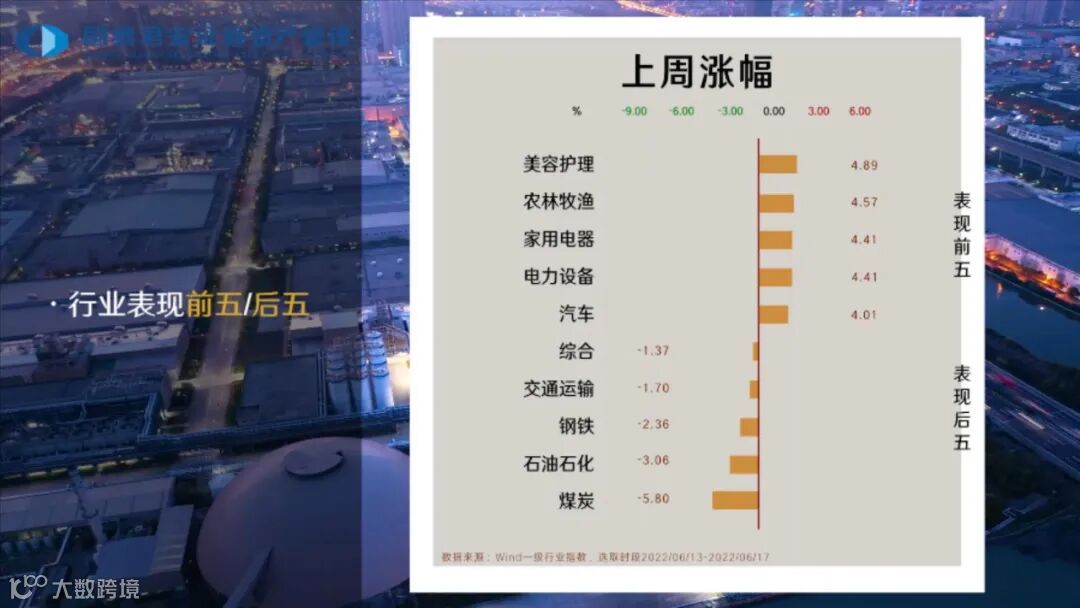 上周行业涨跌互现。美容护理行业领涨,涨幅接近5%,农林牧渔、家用电器等行业均有明显上涨,煤炭行业领跌,跌幅接近6%。