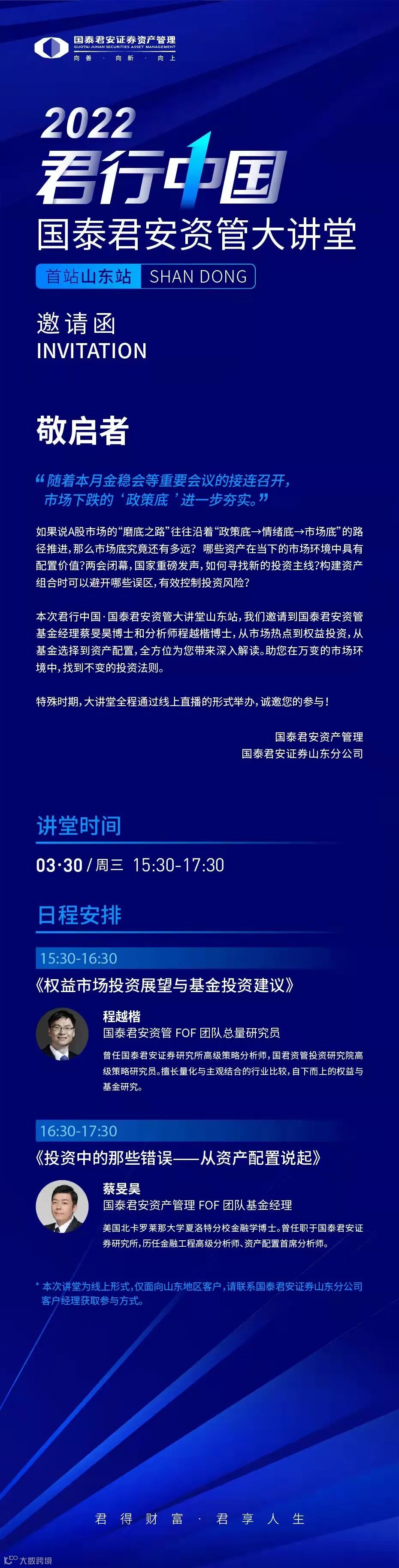 开年以来,市场持续震荡,权益市场出现较大回撤,固收+沦为权益—,理财产品频频破净,市场波动叠加疫情反复,令投资者内心倍感不安。作为头部金融机构,公司始终与广大投资者站在一起。“君行中国”活动首站走进山东,联合国泰君安证券山东分公司,推出线上投教活动,邀请公司FOF团队的两位投研专家蔡旻昊和程越楷,分享投资理念与方法,帮助投资者更加理性地面对市场波动,以长期视角进行资产配置和投资管理。