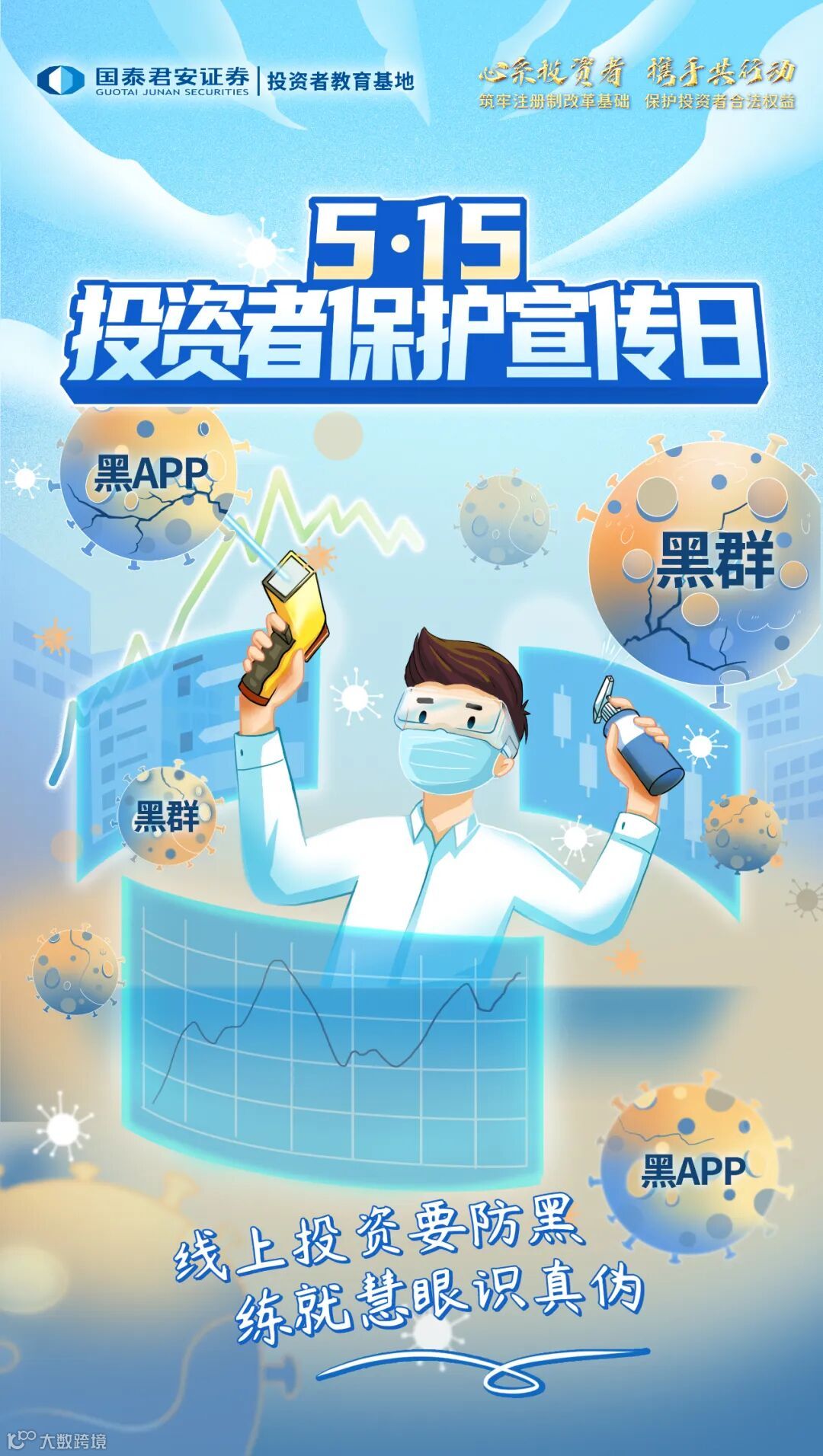 抗疫与防非相结合,投资者戴着防护眼镜和口罩识别出来自网络的“黑群”与“黑APP”病毒,做好防护的同时进行消杀。提醒投资者要用专业知识武装自己,才能抵挡黑群与黑APP的侵袭。手持额温枪代表对真假信息的理性识别,突出投资要选择合法机构,远离非法主体,坚持理性投资,谨防上当受骗。
