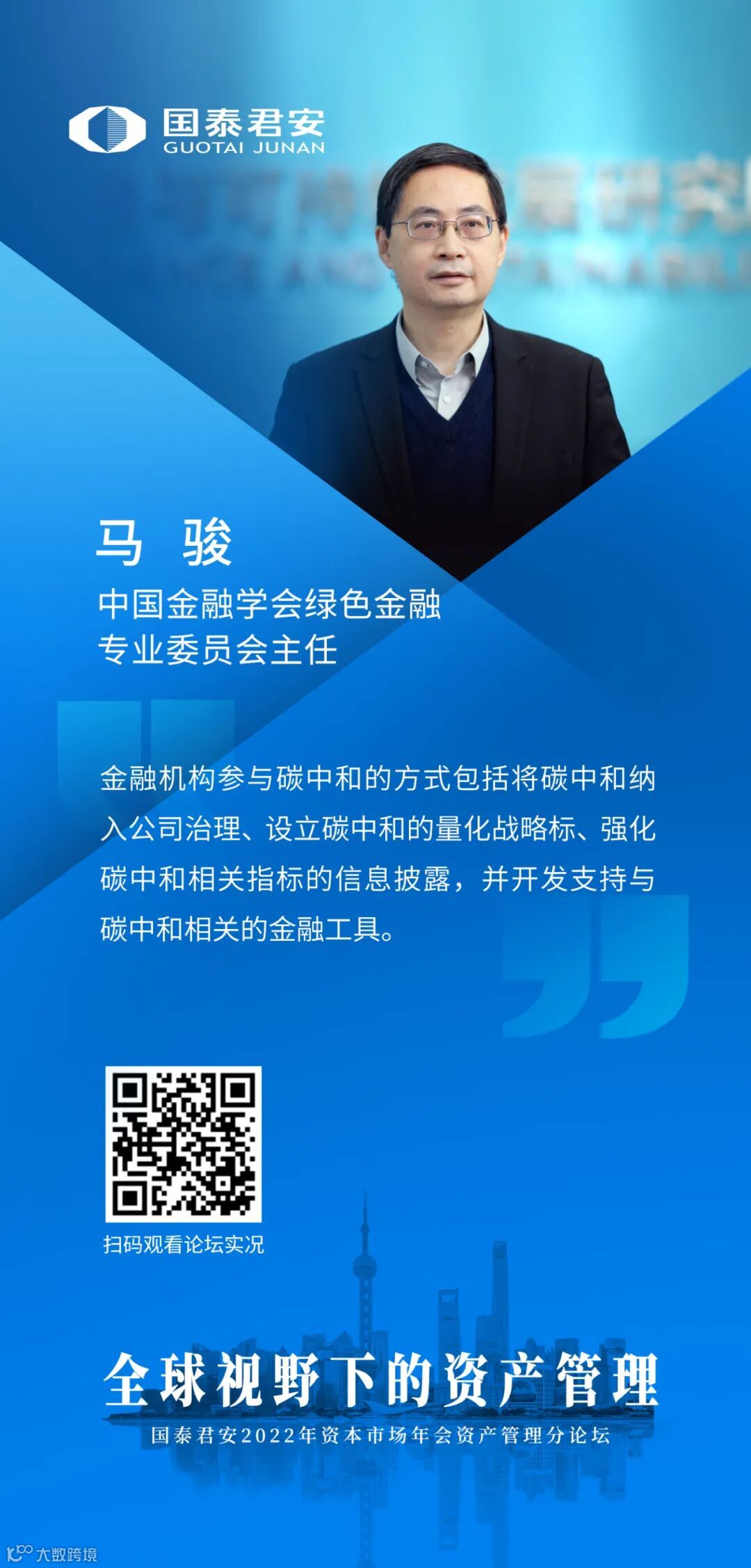 2021年12月3日,由国泰君安证券主办,国泰君安证券资产管理公司、国泰君安创新投资公司、华安基金共同承办的国泰君安2022年资本市场云端年会资产管理分论坛——“全球视野下的资产管理”在云端开幕。会上,中国金融学会绿色金融专业委员会主任马骏先生从北京远程连线,就“碳中和背景下的投资机遇与风险”这一主题发表了演讲。