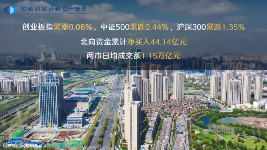 上周A股一大指数上涨,两大指数下跌。创业板指累涨0.06%,中证500累跌0.44%,沪深300累跌1.35%。上周北向资金累计净买入超过44.14亿元。两市日均成交额近1.15万亿元。