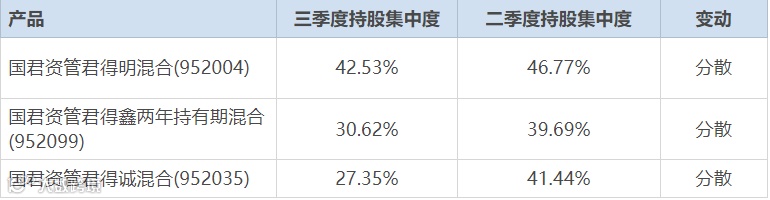 其中,国泰君安资管君得诚的持股集中度下降最多,第三季度前十持仓占比合计27.35%;国泰君安资管君得鑫前十持仓占比合计30.62%,较上一季度下降约9%;国泰君安资管君得明的持股集中度最高,集中度亦有所下降,从46.77%下降至42.53%。