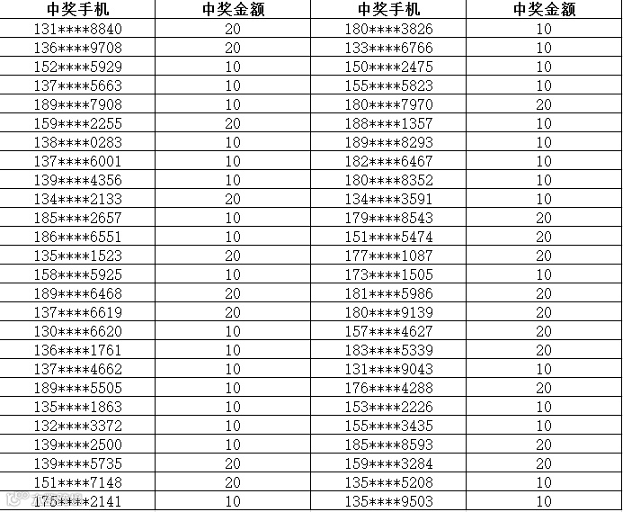 3、中奖金额将于每周五以话费的形式发放到您的中奖手机,届时敬请留意短信