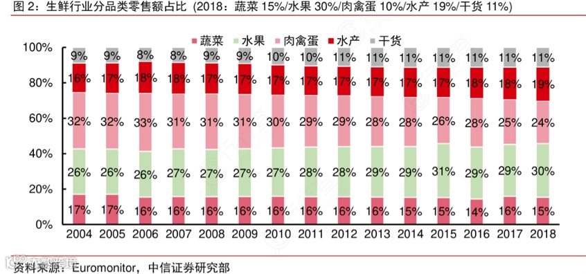 根据相关数据来看,水果在生鲜行业品类零售占比近年来逐步提升,在2013年比重首次超过肉禽蛋类,成为了生鲜行业第一大品类;在2018年占比更是达到了30%,市场份额高达1.5万亿元,占到了整个行业的三分之一左右。