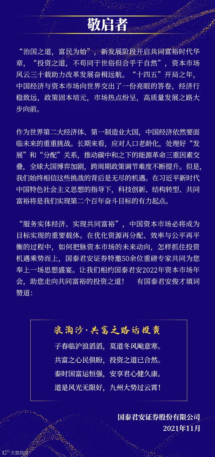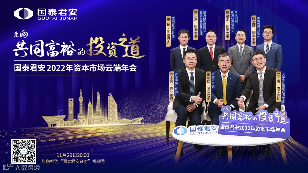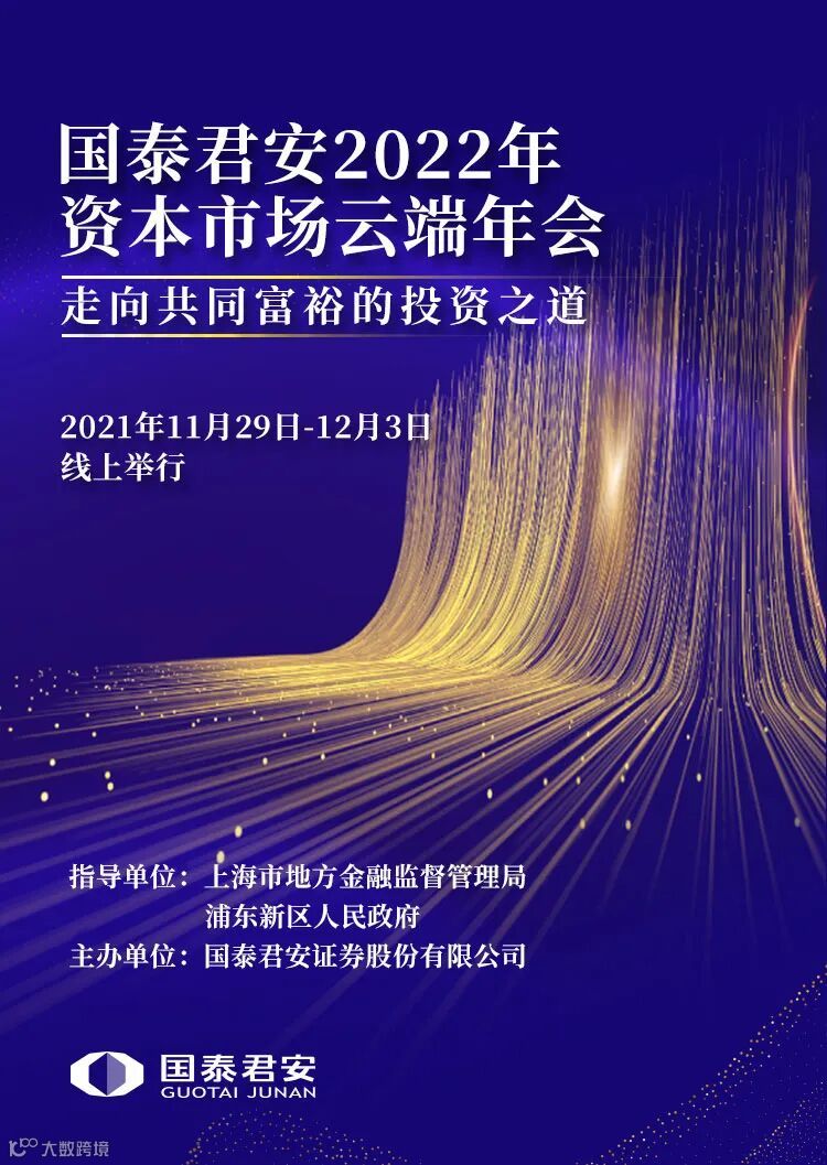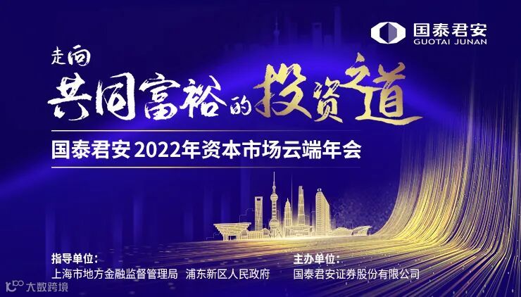 11月29日,由上海市地方金融监督管理局、浦东新区人民政府指导、国泰君安证券主办的“走向共同富裕的投资之道”——国泰君安2022年资本市场云端年会即将盛大开幕。国泰君安党委书记、董事长贺青将发表致辞。