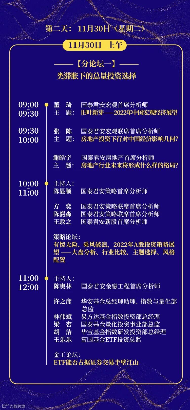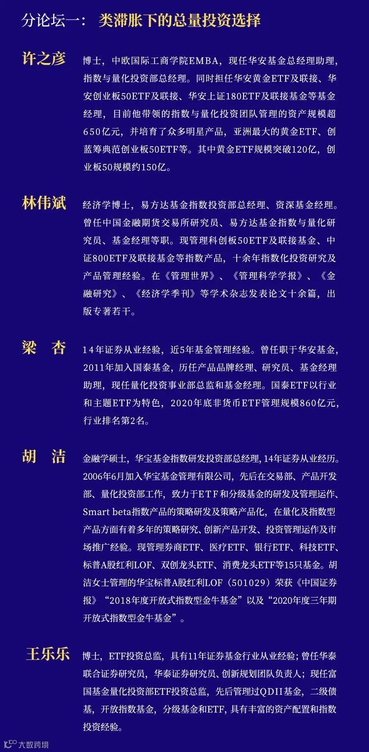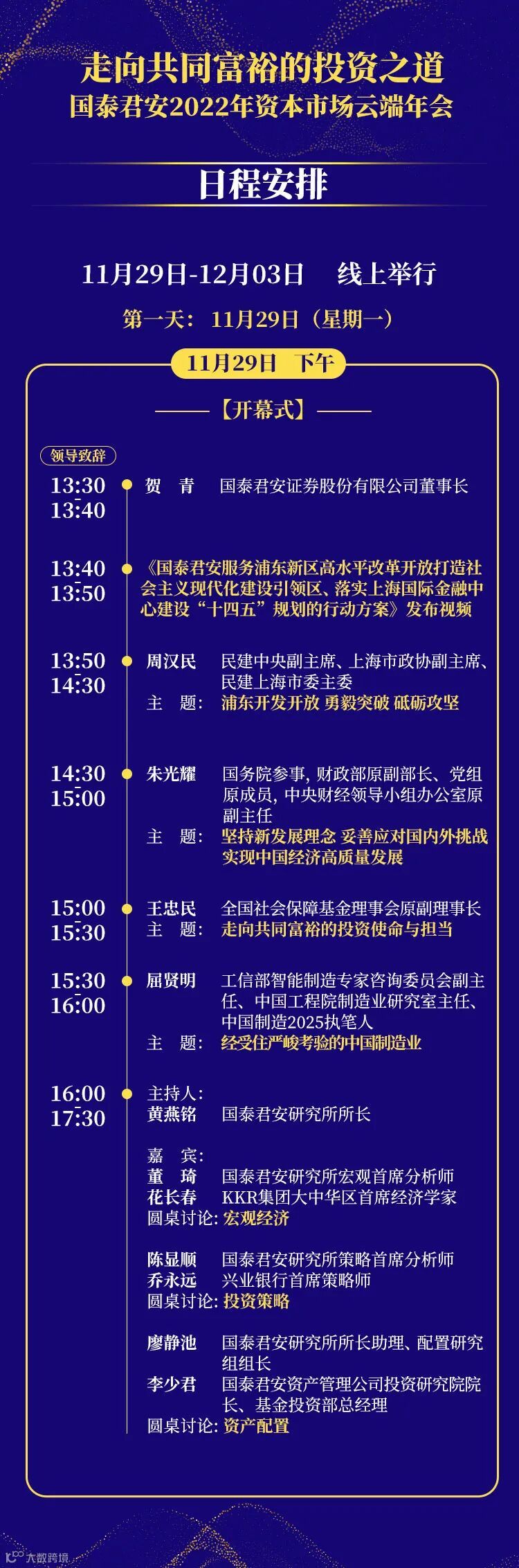 11月29日开幕当日下午总量圆桌论坛由国泰君安证券研究所所长黄燕铭主持,将邀请KKR集团大中华区首席经济学家花长春对话国泰君安证券研究所宏观首席分析师董琦,在梳理2021年以来宏观经济的形势和变化脉络的同时,对2022年宏观经济进行展望,对市场分歧较大的观点进行深入剖析;在A股投资策略研判上,将由兴业银行首席策略分析师乔永远对话国泰君安证券研究所策略首席分析师陈显顺,为投资者自上而下梳理后疫情时代的重点方向,研判2022年A股市场的投资机会;相对于宏观经济和策略分析,资产配置对于国内投资者来说还相对陌生,国泰君安资产管理公司投资研究院院长、基金投资部总经理李少君与国泰君安证券研究所所长助理、配置研究组组长廖静池将先从大类资产配置的核心思想和理念以及主动权益投资和大类资产配置的差异等基础理论谈起,逐渐深入到2022年全年资产配置的方式方向和方法。