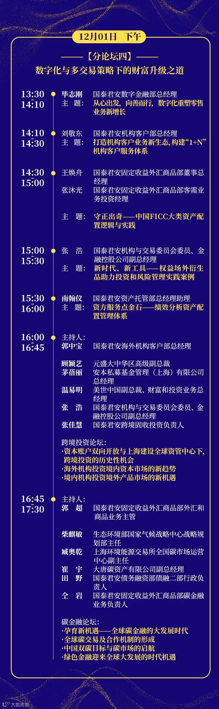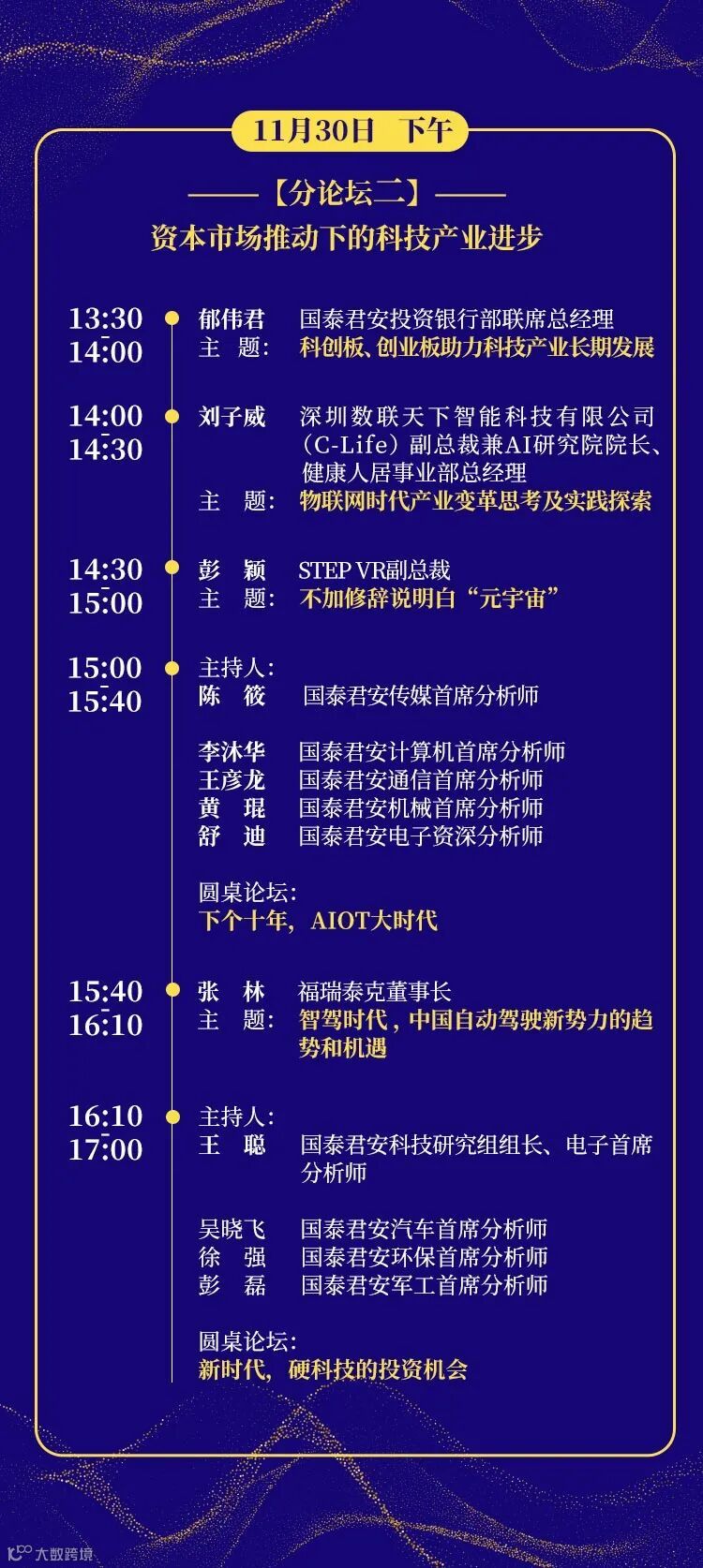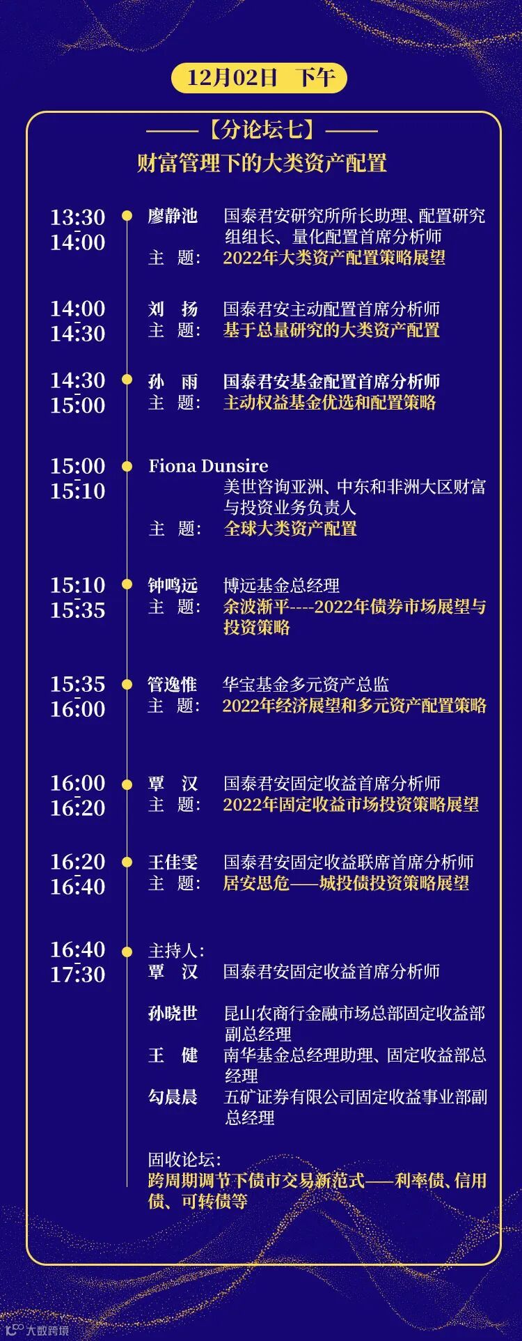 11月29日开幕当日下午总量圆桌论坛由国泰君安证券研究所所长黄燕铭主持,将邀请KKR集团大中华区首席经济学家花长春对话国泰君安证券研究所宏观首席分析师董琦,在梳理2021年以来宏观经济的形势和变化脉络的同时,对2022年宏观经济进行展望,对市场分歧较大的观点进行深入剖析;在A股投资策略研判上,将由兴业银行首席策略分析师乔永远对话国泰君安证券研究所策略首席分析师陈显顺,为投资者自上而下梳理后疫情时代的重点方向,研判2022年A股市场的投资机会;相对于宏观经济和策略分析,资产配置对于国内投资者来说还相对陌生,国泰君安资产管理公司投资研究院院长、基金投资部总经理李少君与国泰君安证券研究所所长助理、配置研究组组长廖静池将先从大类资产配置的核心思想和理念以及主动权益投资和大类资产配置的差异等基础理论谈起,逐渐深入到2022年全年资产配置的方式方向和方法。
