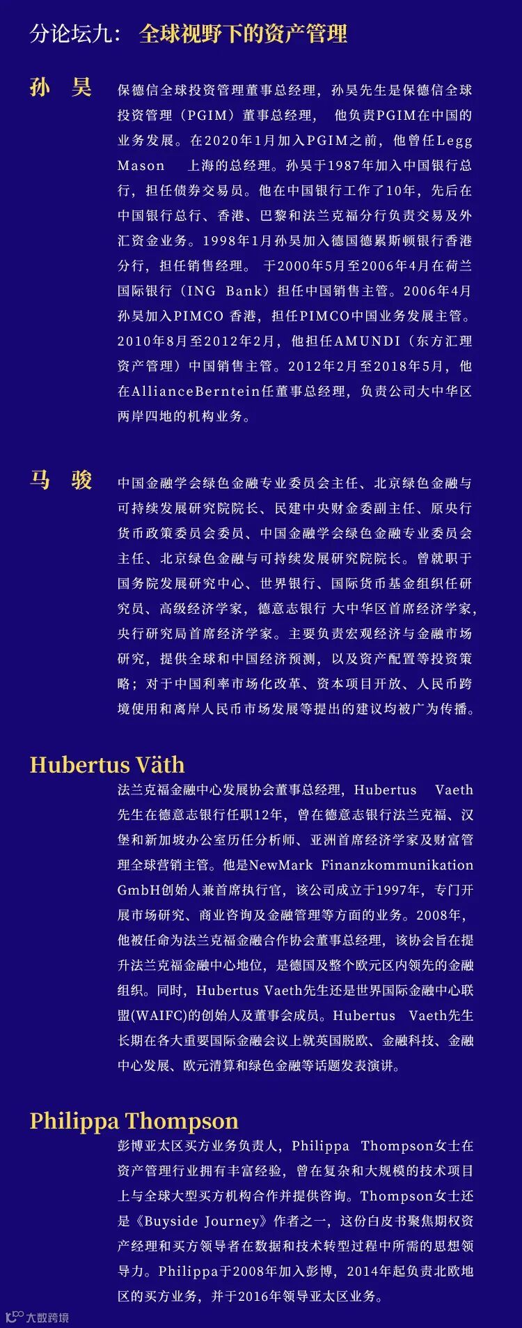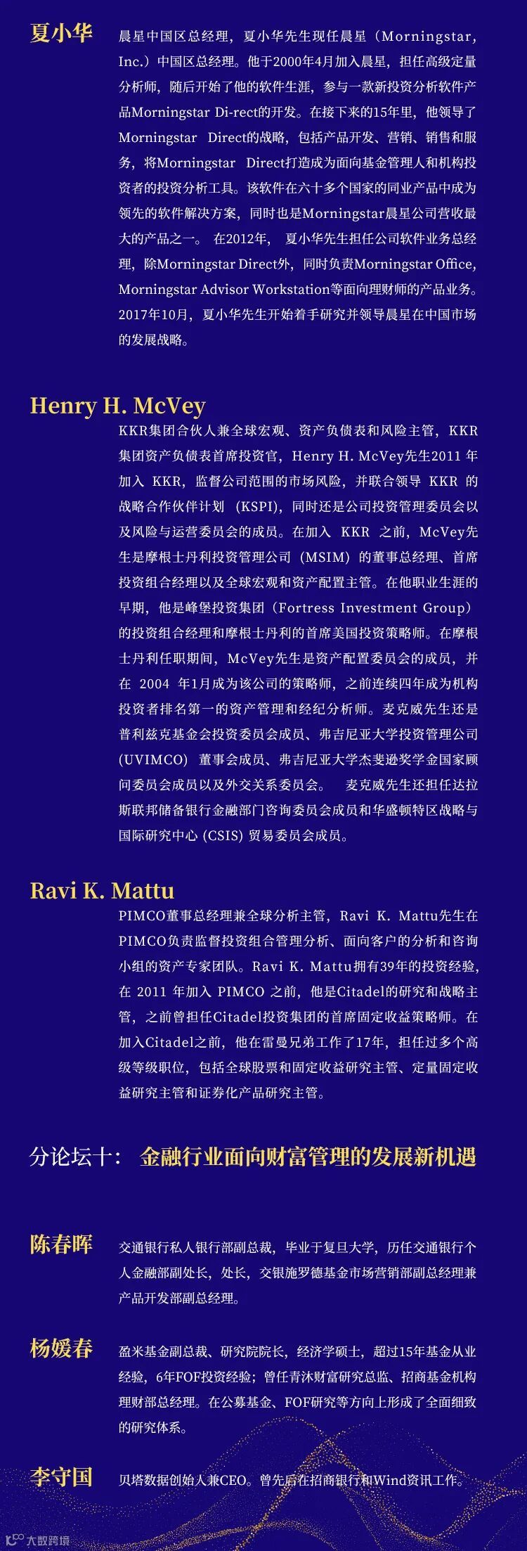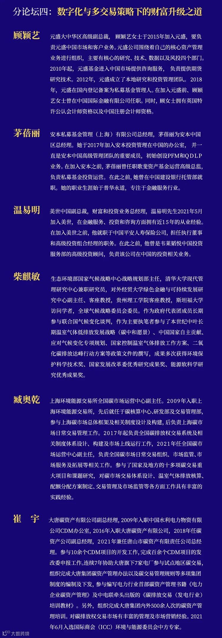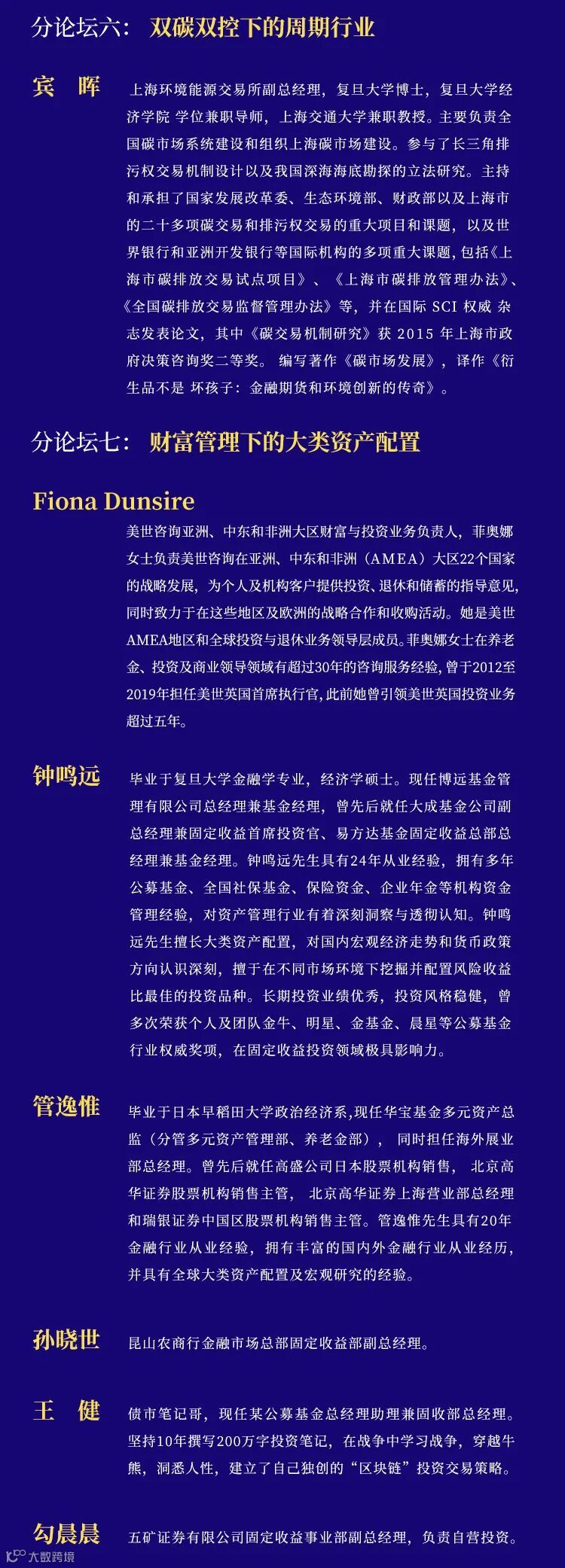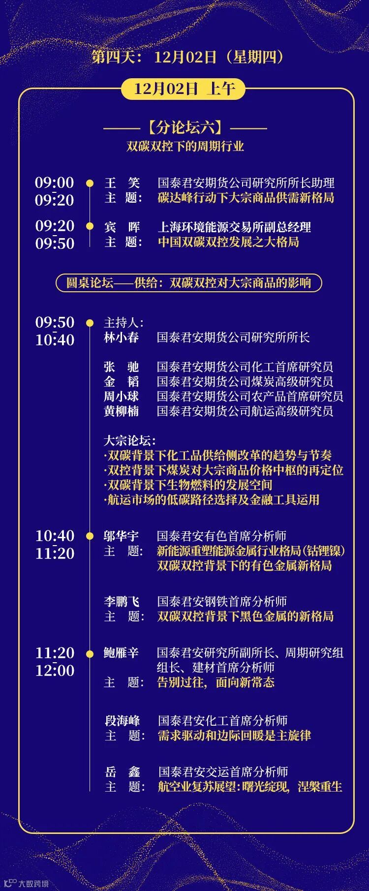 本次年会为期五天,共设一个主论坛和十个主题分论坛,来自生态环境部、农业部、上海环境能源交易所、香港证券交易所、KKR、PIMCO、彭博等机构的五十多位专家和权威人士,和来自国泰君安证券研究所、期货公司研究所、资产管理公司以及投资银行与各专业条线的近八十位专业研究人员与业务人员,在共同富裕的主题下,将从宏观经济、资产配置、生物医药、新能源、科技制造、大众消费、资产管理、财富管理等重要领域,就2022年的经济发展和投资策略,与投资者共同进行深度的分析与探讨。