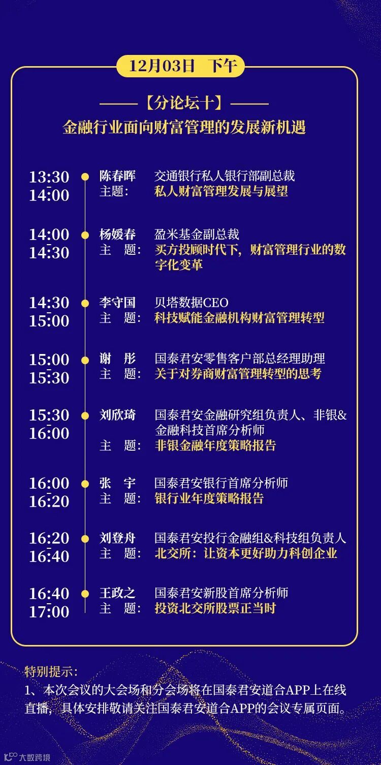 本次年会将全程通过线上渠道播出,欢迎登陆国泰君安官方网站、国泰君安发布官方微信关注最新动态,亦可通过国泰君安证券视频号、国泰君安道合APP、国泰君安君弘APP点击观看。