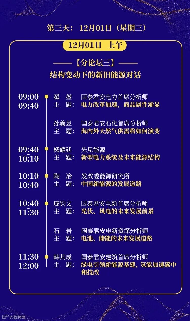 12月3日晚年会收官之夜,将由国泰君安证券研究所所长黄燕铭携多位明星分析师与重磅专家,围绕“2022年宏观趋势与投资策略”、“产业转型与科技创新”、“绿色发展与能源变革”、“共同富裕与消费复苏”、“财富管理与资产配置”五大核心议题,与广大的投资者朋友在云端共话“走向共同富裕的投资之道”。