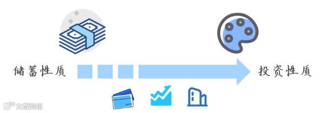 一方面,同一资产可以兼具储蓄性质和投资性质。如果按照储蓄和投资性质的程度,将各类资产放在一个坐标轴上,现金和艺术品位于坐标轴的两个极端。在两个端点之间并没有明确的界限,是一个相对比较连续的坐标。有些资产风险和收益属性高、更偏投资,有些资产则相对比较安全、更偏储蓄。