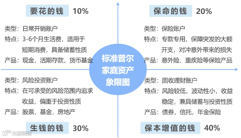 “标准普尔家庭资产象限图”把家庭资产分成四个账户,四个账户的作用各不相同,我们可以根据自身情况,按照合理的比例进行分配。
