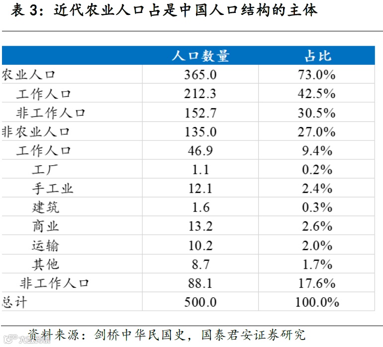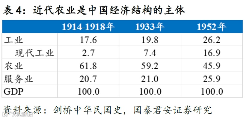 虽然这个阶段中国工业和城市有所发展,但与西方国家相比,仍然非常落后,中国总体上仍是一个农业社会,以1933年为例,农业人口占比仍高达73%,非农业人口仅约27%。农业是中国经济的主体,占比超过50%,但农村地权分布极不均衡,前10%的地主占据了将近60%的土地。