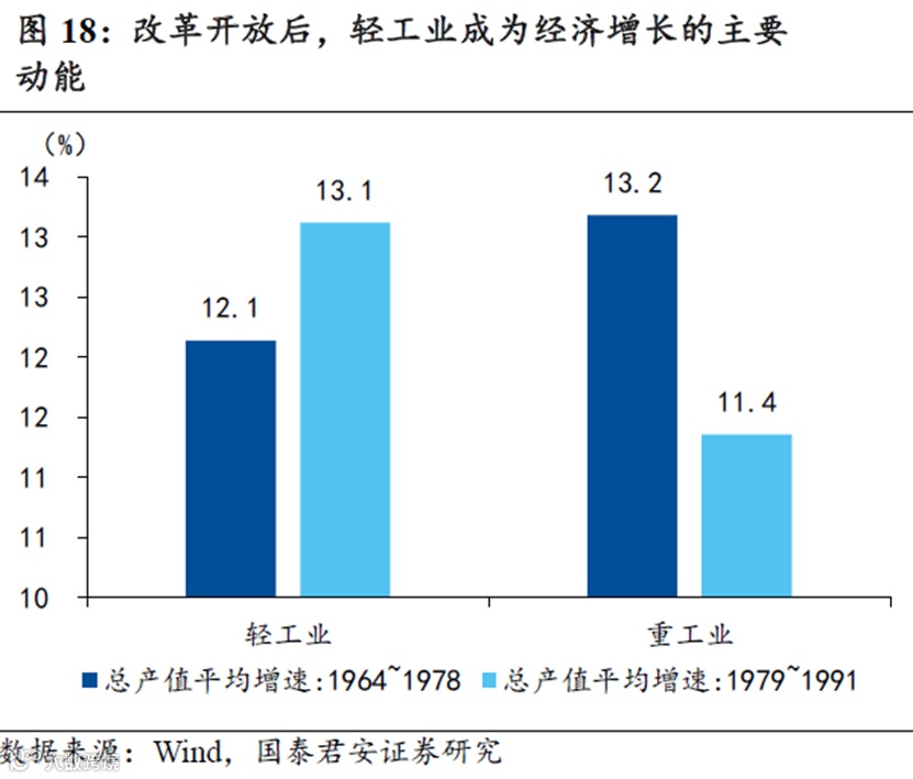 面对人民生活困难、生活资料短缺的问题,我国加大对于农业、轻工业、服务业的支持力度。在1979~1991年间,我国农业增加值年均增长5.3%,相较于改革开放前的30年大幅提升了3个百分点;服务业的增加值提升的幅度更为明显,从5.9%提升至11.2%,其增速已经超过第二产业。从第二产业分项来看,轻工业总产值增速也出现了一定程度的提升,年均增速达到13.1%,重工业则由13.2%的高增速回落至11.4%。