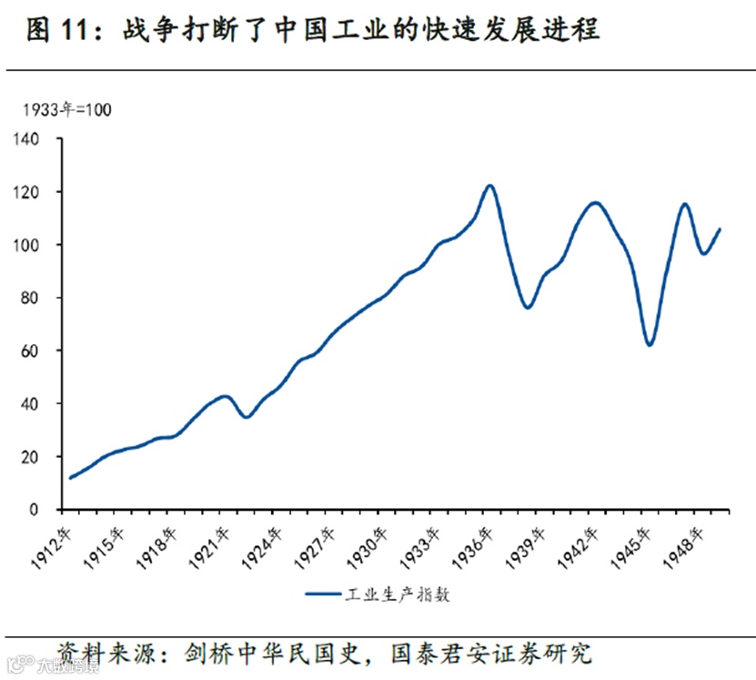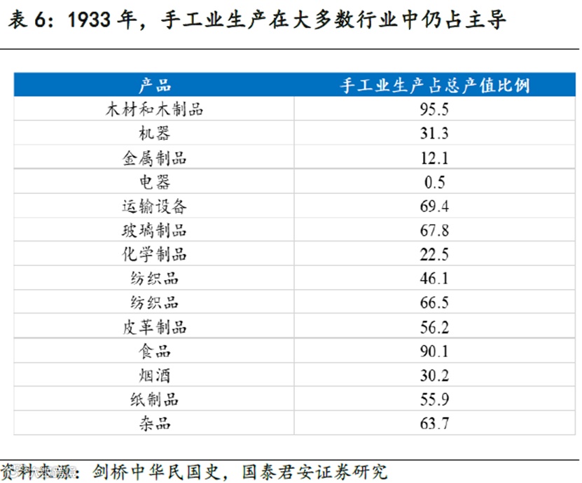 1920年至1936年,中国工业快速发展,但随之而来的抗日战争和解放战争打断了中国工业的进程。从结构上来看,中国工业发展水平并不高,以1933年为例,手工业生产在绝大多数行业中仍占主导,现代机械生产只能居于次要地位。