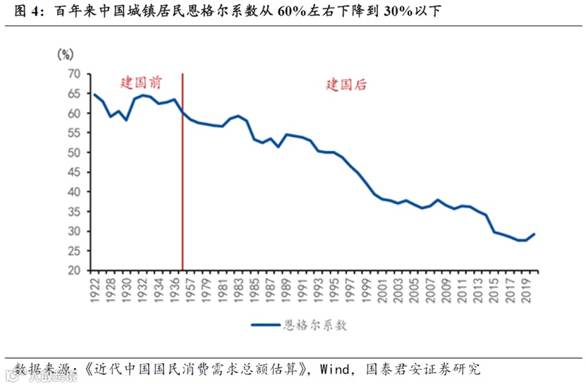 伴随我国工业部门变大变强,人民生活水平也在持续提高,首先反映在食品等基本生活支出占比的下降。城镇居民恩格尔系数从建国前的60%左右下降到如今的30%以下。20世纪20-30年代,我国城镇居民的食品支出占家庭总支出的比重始终在60%左右徘徊。建国后到1978年,由于实行重工业有限的发展战略,人民生活水平提高较为缓慢,但恩格尔系数仍然从1949年的60.25%降到1978年的57.5%;而改革开放以来,随着经济总量的快速增长和轻重工业结构的渐趋合理,城镇居民恩格尔系数快速下降,到2015年首次降到30%以下。
