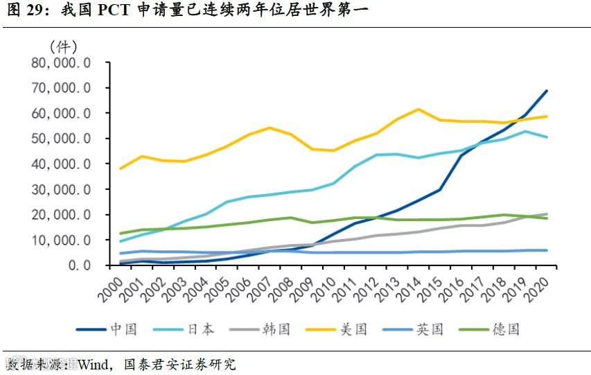 供给侧的新变化。人口红利逐步消退,工程师红利却渐渐酝酿发酵。资本积累、人口增长、技术进步是经济增长的三大要素,随着劳动年龄人口增速的见顶回落,经济增速下降也在所难免。2010年之后,我国经济增速是逐步下降的,在此期间,我国劳动年龄人口增速也处在不断下降过程中。但同时,我国也积累了大批高学历、高质量劳动力。劳动力增速在下降,质量却在提高,工程师红利逐步取代人口红利成为经济增长新的动力,其中一个重要表现是我国PCT申请量在2008年以后快速增加,先后超过英国、韩国、德国、日本和美国等主要发达国家,自2019年起位居世界第一。
