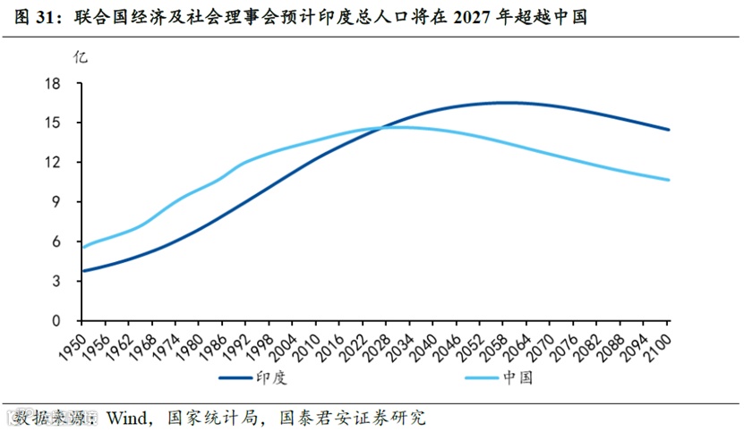 未来5~10年,除了将迎来总人口拐点,中国还将在人类历史上首次失去第一人口大国的头衔。在人类的文明史上,中国始终是毫无争议的第一人口大国,但是在未来5~10年里这一历史“铁律”即将发生改变。根据联合国经济及社会理事会的测算,印度总人口将在2027年首次超越中国,并在之后长期保持对中国的人口数量优势。