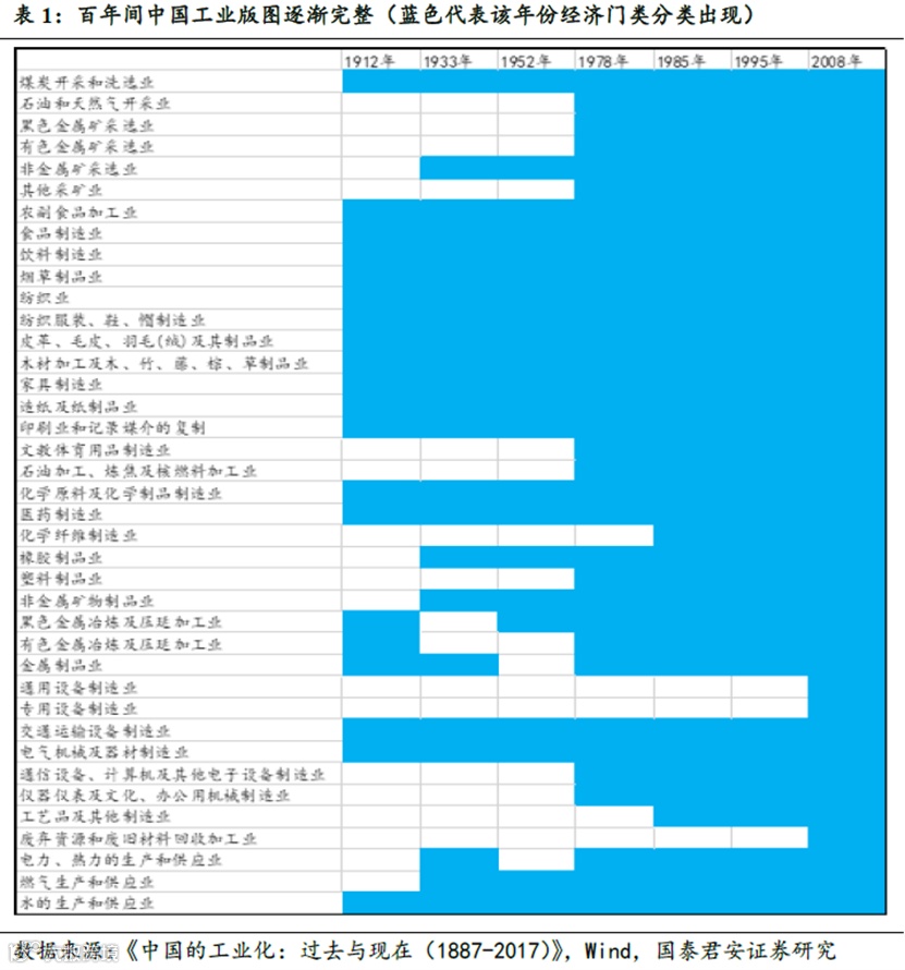 轻重工业部门转换的背后是我国工业门类的日趋齐全。建国以前,我国石油和天然气开采、黑色金属、有色金属矿采选业、化学纤维制造业等部门几乎是空白,体现了建国前轻工业为主导的特征;建国后,在前期苏联援助和后期独立自主的发展方针下,我国重工业部门的版图日趋完善;改革开放后,通过引进国外先进技术和自主研发,我国又逐步建立起通用设备制造、专用设备制造等高端装备制造业门类。完整的工业门类为我国抵御外部冲击提供了有效的缓冲。