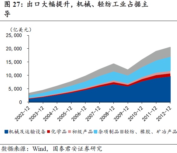 加入WTO之后,我国出口迎来了飞速增长阶段,重工业和轻工业全面受益,我国成为“世界工厂”。