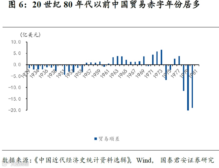 从20世纪20年代到建国初期,我国对外贸易在大部分年份均呈现赤字状态。特别是在建国初期,由于苏联的大规模援助,我国的贸易赤字曾达到3.2亿美元。20世纪70年代末到80年代初,我国也由于引进美国等西方国家大量先进技术和生产线导致巨额贸易赤字。但20世纪90年代以来,随着对外开放步伐加快,“出口导向”型发展道路使得中国开始承担世界工厂的身份,特别是全球第四次产业链迁移过程中,我国贸易盈余迅速扩张,2015年达到最高的5900亿美元,成为名副其实的“世界工厂”。未来随着市场的进一步开放,以及在全球产业链上向上迁移,中国将进一步从“世界工厂”变成“世界市场”。