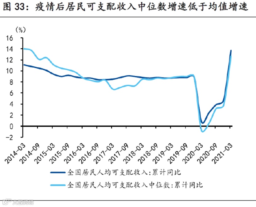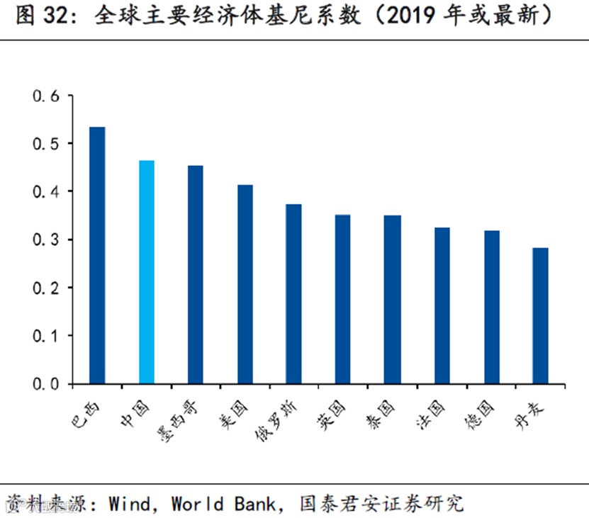 中国仍然存在一定的贫富差距问题,并且疫情后出现了收入差距扩大的趋势。改革开放以来,通过允许一部分人、一部分地区先富起来,先富带后富,极大解放和发展了社会生产力。金融危机之后,中国收入不平等的情况有所改善,基尼系数从2008年的0.491降至2019年的0.465,但是在全球范围内还是属于相对较高的水平,主要经济体中仅略低于巴西,和欧美发达经济体差距较大。新冠疫情以来,中低收入群体收入受冲击更大,居民收入中位数的同比增速重新低于人均收入同比增速,反映了收入差距出现扩大趋势。