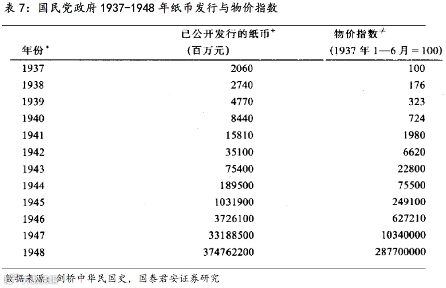 货币金融方面,由于国民党政府在战争中没有严肃的财政纪律要求,大量财政赤字由中央银行印发纸币填补,导致通货膨胀急剧上升,1948年物价相较于1937年上涨了287万倍,纸币形同废纸,金融体系完全崩溃,经济濒临崩溃边缘。