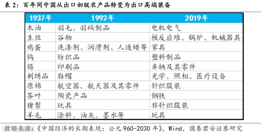 从全球分工来看,百年间中国实现了出口初级农产品向出口高端装备产品的转变。在从贸易赤字向贸易盈余转换的同时,我国在全球贸易体系中的分工地位也在不断爬坡。1937年,我国出口结构以农产品和矿产为主,而进口品包括初级工业原材料以及工业设备,体现了典型的基础工业薄弱、出口产品价值量低的特征;而到2015年,电机电气、车辆零部件等已经成为主要出口产品。