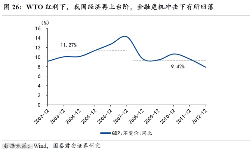 2002~2012年间中国在不断深化经济体制改革的同时,保持了国家发展战略与决策的稳定性和连续性,为经济高速增长创造了良好的制度环境。在2007年之前,我国正处于加入WTO的红利期,因而经济增速持续提升,达到了11.37%的年均增速;由于全球金融危机的冲击以及WTO的红利期结束,我国经济开始回调,在2008~2012年间经济增速中枢回落至9.42%。