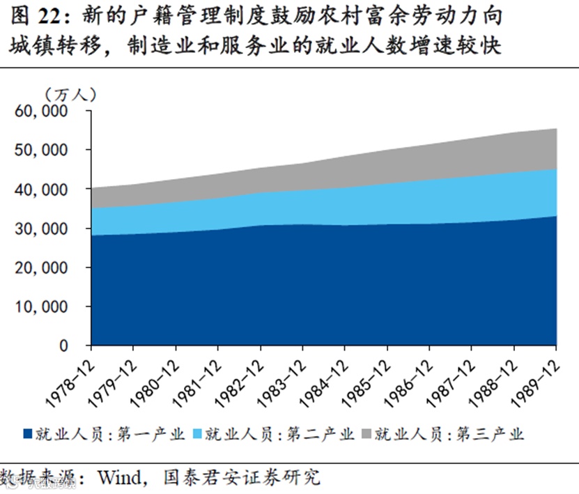 1984年国务院发布《关于农民进入集镇落户问题的通知》和1985年公安部颁布《关于城镇人口管理的暂行规定》之后,人口流动管制放松为农村富余劳动力向城镇和非农产业转移提供了必要的制度支持,从就业结构来看,这段时期我国制造业和服务业的劳动力增速较快,分别由6945万人、4890万人提升至14015万人、12378万人,而农业的劳动力则变化不大,这主要是由于在新的户籍管理制度下,农村富余劳动力能够自由地流向城镇,在这一系列的就业政策支持下,我国逐步从“做大蛋糕”向“分好蛋糕”转变。