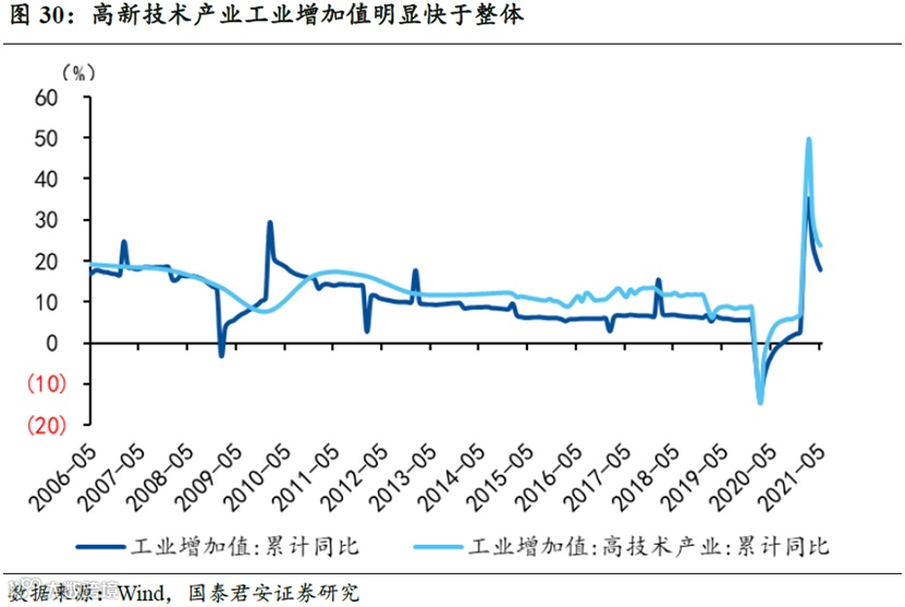 经济内生增长动力的提升以及产业结构的调整。得益于改革的持续推进,以及国家采取的配套财政、金融、产业、物流等一系列积极政策,极大地激发了经济增长的内生动力,我国高新技术产业蓬勃发展,即使在疫情爆发的2020年仍然保持着旺盛的生命力,2020年全年工业增加值同比增长仅2.8%,但高新技术产业则保持了7%以上的增速。正如随着产业结构从农业转向工业,在此期间,产业结构也悄然发生变化,随着高新技术产业占比的不断提升,我国产业结构也从劳动力密集型向资本密集型、技术密集型不断过渡,与之伴生的是更多劳动力进入服务业,从而带来服务业占比的不断提升,到2019年服务业占比达到63.5%,相比2012年提升18.5%。