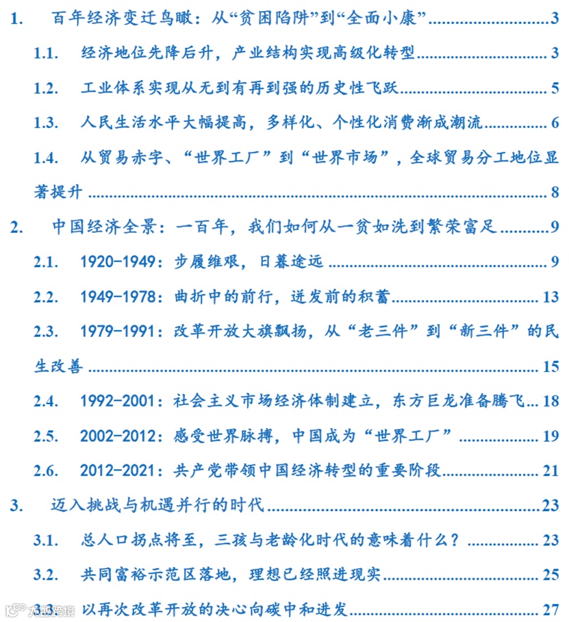 建党一百周年之际,我们回顾了中国经济增长所实现的伟大成就,如何从步履维艰到巨龙腾飞。百年之后的今天,每一个中国人依然在历史的洪流中前行,通过百年经济梳理,我们想向各位读者传达的是一份自强不息的乐观精神,一份面对时代褒贬分明的态度,一份对国家更加强烈的荣辱感。献礼建党一百周年,国君宏观团队祝福我党永葆青春、祖国繁荣富强,也祝愿每一个奋勇前行的赶路人,每每在抬头仰望之际都能看到繁星满天,心火不灭,脚下生风。