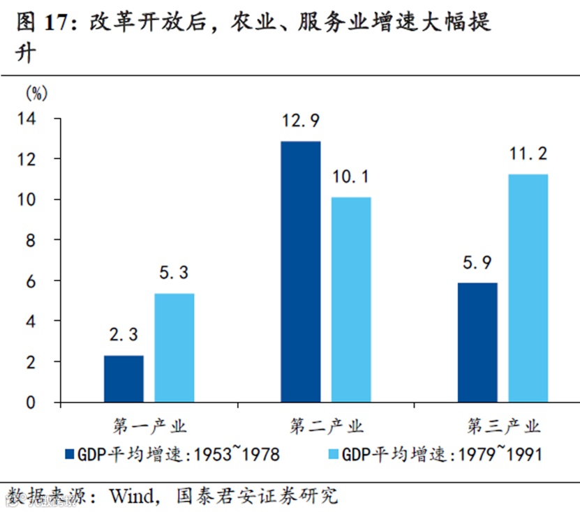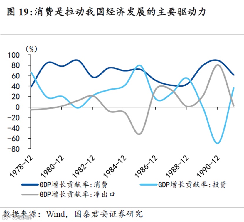 1978年底,改革开放标志着中国经济正式启航,在改革开放初期,我国农业、轻工业、服务业快速发展,生活资料的充足供给带动人民消费的积极性,成为拉动经济增长的关键动因。