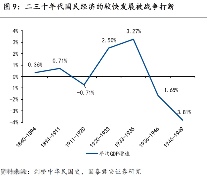 1920年至1949年,在“帝国主义、封建主义和官僚资本主义”的压迫之下,中国经济步履维艰。建党后的经济发展大致可以划分为两个阶段,第一段为1920年至1937年抗日战争全面爆发前,国民经济在该阶段仍然实现了一定发展,GDP年均增速达到2.6%,其中在1933年至1936年GDP年均增速更是达到了3.3%,创1894年中日甲午战争以来新高。第二段是1937年至1949年的战争时期,该段时期中国GDP快速下降,同时伴随着恶性通胀和金融系统的崩溃,国民经济走向崩溃的边缘。