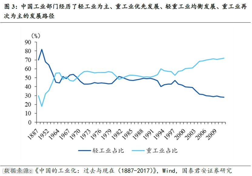 百年间,中国工业部门经历了轻工业为主、重工业优先发展、轻重工业均衡发展、重工业再次为主的发展路径。从经济规律来看,工业化一般经历从轻工业为主向重工业为主的发展历程。建国前,中国工业部门以轻工业为主,符合工业化早期的基本特征,原因是民族资本尚处于幼稚期,未能给发展重工业积累足够的原始资本。到建国时,中国重工业占工业部门比重仅有30%。建国后的30年间,为迅速建立起工业基础,打破国外敌对势力的威胁,我国采取了重工业优先发展战略,重工业占比曾一度达到66.7%;改革开放后至20世纪末,为着力改善人民生活水平,重工业部门占比有所回落,轻重工业部门基本处于均衡发展态势;21世纪初加入世贸组织后,中国成为“世界工厂”,重工业比重再次迅速提升,占比达到70%以上。如今我国仍是一个以重工业为主的工业化国家。