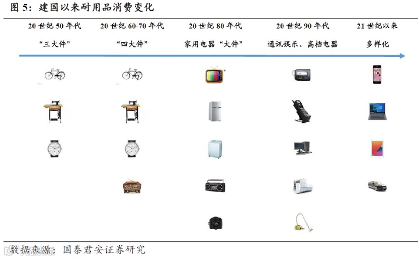 20世纪50-70年代,自行车、缝纫机、手表、收音机等被称为“三转一响”的四大件是生活质量的象征;20世纪70年代末-80年代初,随着轻工业繁荣和人民生活水平的提高,传统“四大件”逐渐被彩色电视机、冰箱、洗衣机等家用电器“大件”所取代;20世纪90年代则是通讯娱乐大发展的时期,BP机、大哥大成为身份的象征。1994年4月20日,我国成功实现与国际互联网的全功能连接,正式进入互联网时代,随后个人电脑走进千家万户;与此同时,空调、吸尘器等高档家用电器也在城市和乡村逐渐普及。
