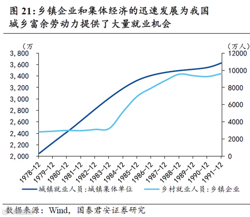 改革开放初期,中国城乡均存在大量富余劳动力,1984年以后城镇国有企业与集体企业推行厂长负责制改革,调动了城镇职工的工作积极性,乡镇企业和集体经济进入快速发展状态,城镇集体单位的就业人数由2048万人迅速提升至3628万人,乡镇企业则由2827万人飙升至9609万人。
