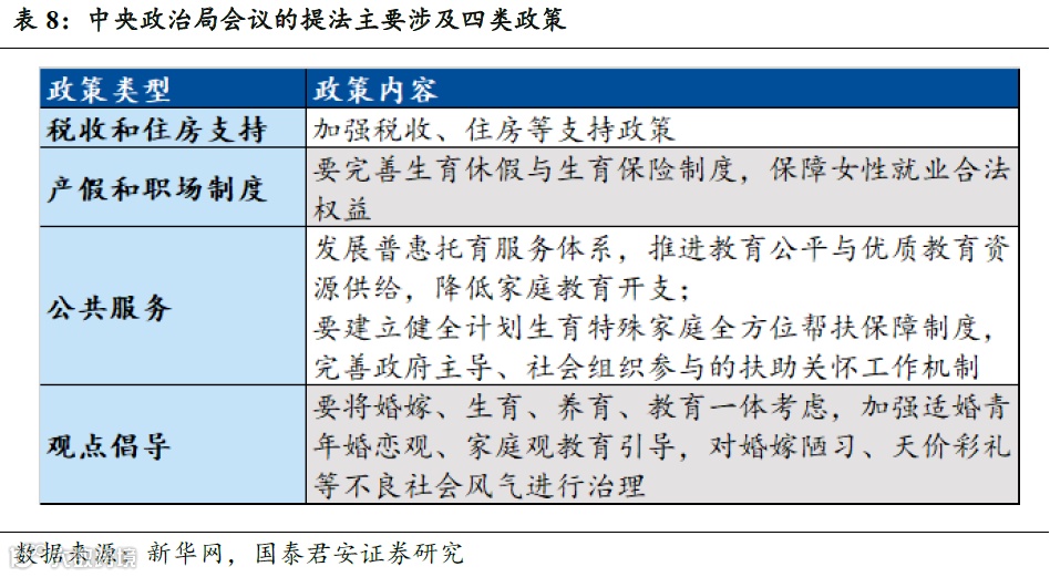 人口政策已经开始转向,三孩和配套生育支持政策即将全面实施。5月31日,中共中央政治局召开会议,审议《关于优化生育政策促进人口长期均衡发展的决定》,实施一对夫妻可以生育三个子女政策及配套支持措施。我们梳理后发现,政治局会议提及的支持政策包括了税收和住房支持、产假和职场制度、公共服务、观点倡导这四类。6月18日国务院常务会议通过《中华人民共和国人口与计划生育法〈修正草案〉》,决定提请全国人大常委会审议,预计三孩政策即将落地。